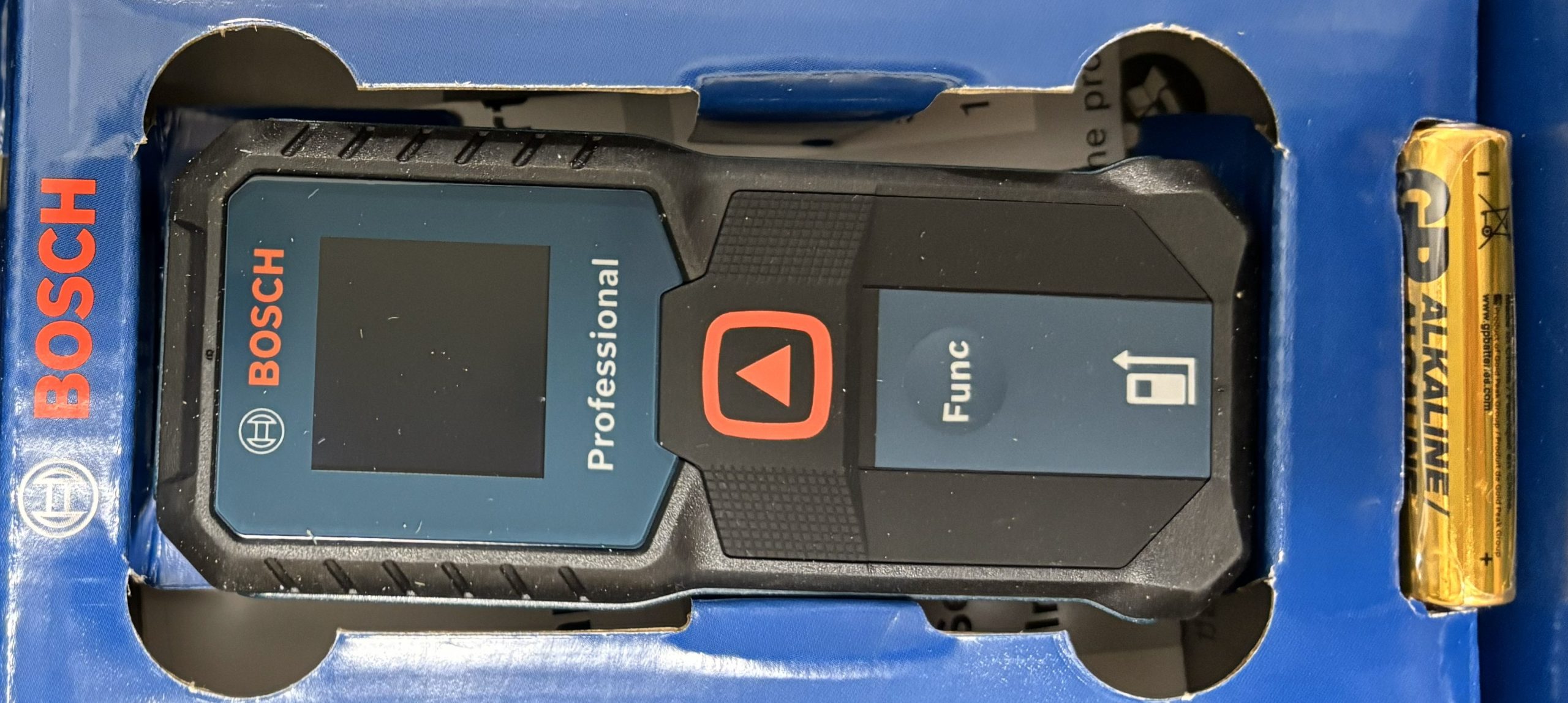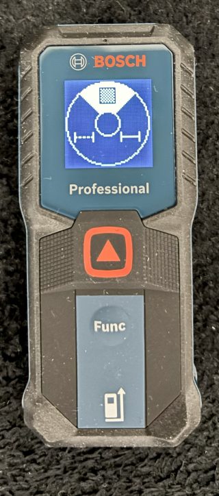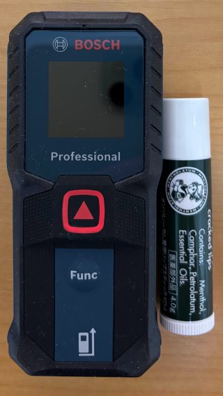 GLM 30-23は「ボタン2つ」で測定は本体中央の赤い▲ボタンを押すだけです。機能の切り替えは本体下部のグレーのFuncボタンです。