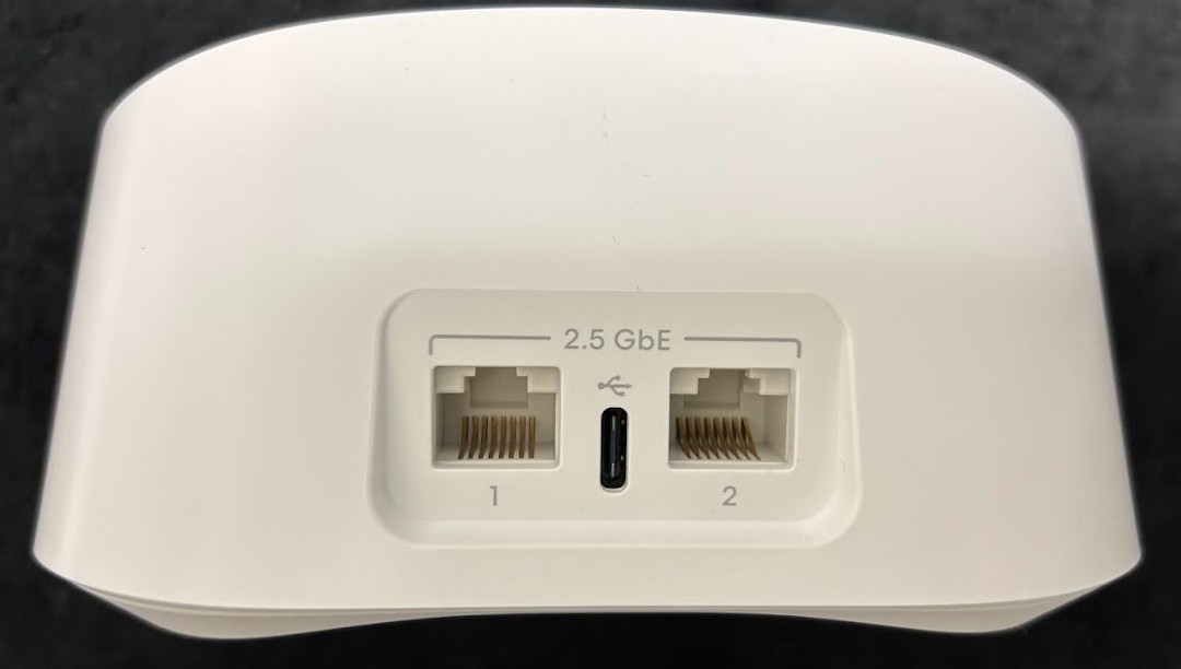本体の後ろには2.5GbEポートが2つあるので、PCやゲーム機を有線でつなぎたい人にも使いやすいと思います。しかも自動検知ポートなので、最初の配線で迷いにくいのも助かります。真ん中のUSB-Type Cは電源で使用します。
