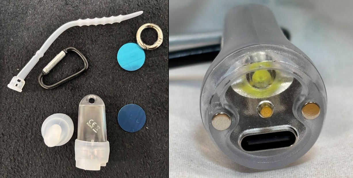 付属品と本体下部を紹介すると、付属品はカラビナ以外に、リングと青いスチールの板がついてきます。この青いスチールの板には両面テープが付いていますので、木などライト本体を固定したい場所に張り付けて使用します。