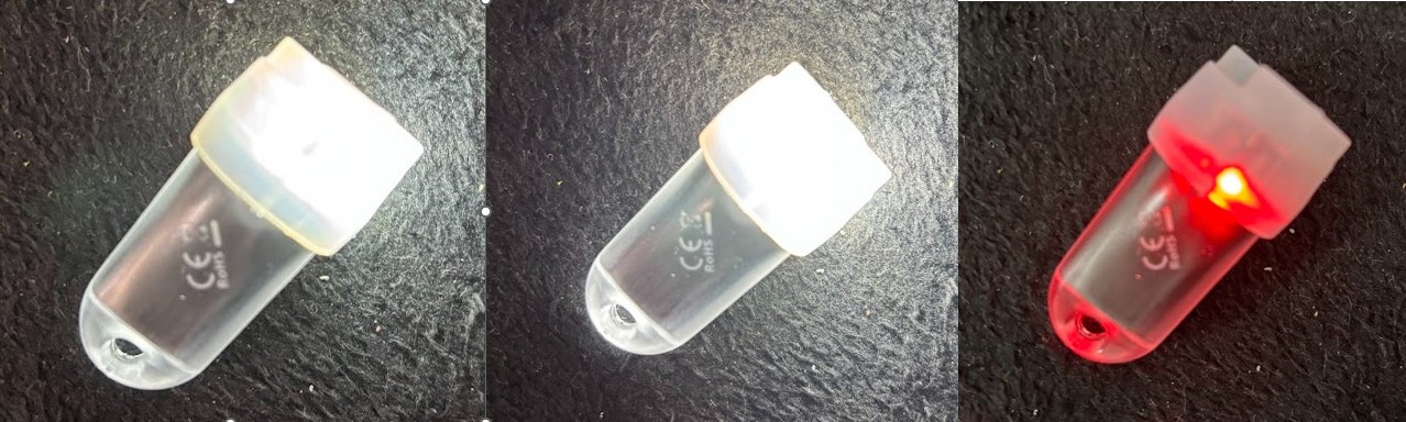 下の写真は、一般的なLED照明の点灯下で撮影した写真です。左から弱光、強光、レッド点滅です。明るさの参考にしてください。