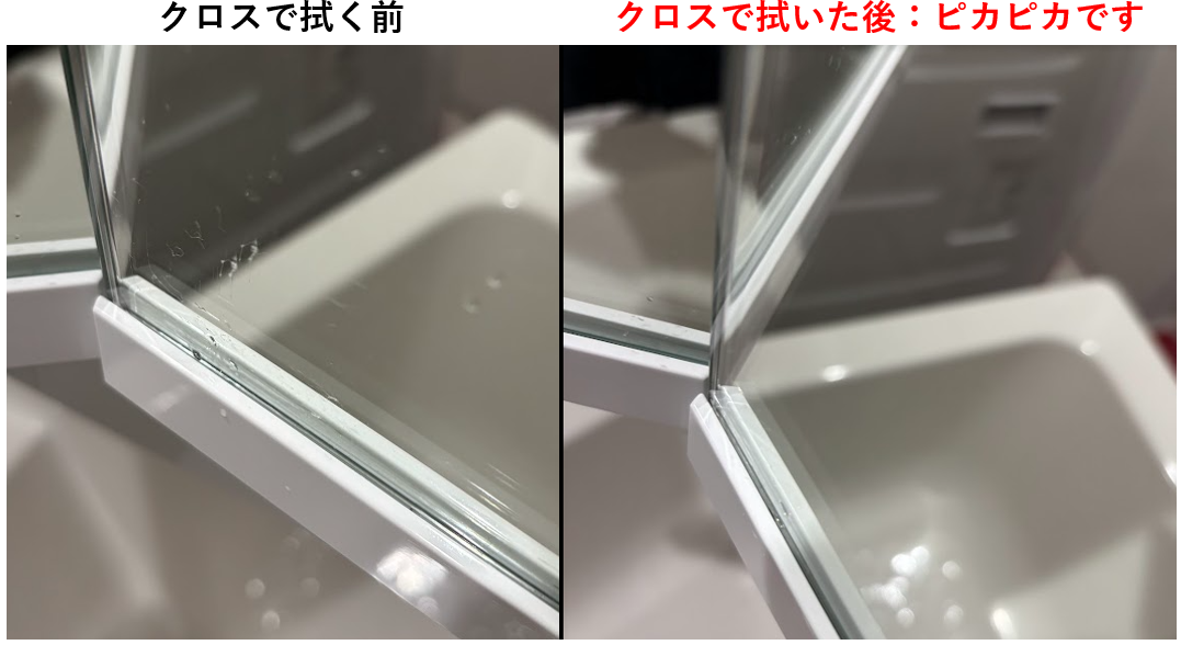 クロスが乾燥した状態で拭くだけで水垢が取れて簡単に鏡がピカピカになります。