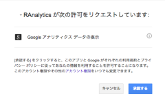 同意画面が表示されるのでメールアドレスを選択後、赤枠部分「サービス名」にRAnalyticsと入力し「保存」をクリックします。